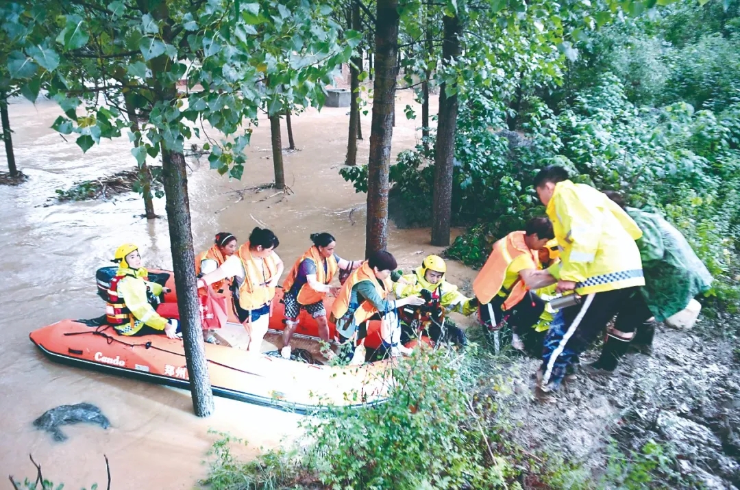 7月20日,受持續(xù)強(qiáng)降雨影響,河南省鄭州市單日降雨量突破歷史極值,單小時降雨量超過日歷史極值,嚴(yán)重威脅群眾生命財產(chǎn)安全。圖為當(dāng)日,消防救援人員在該市唐莊鎮(zhèn)龍頭村轉(zhuǎn)移被困村民。